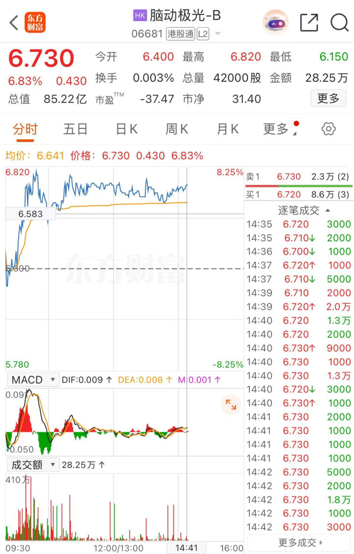 上证报中国证券网讯(记者孔令仪)12月29日,脑动极光-B一度涨超8%,最高报6.82港元/股。截至14时41分,脑动极光-B涨6.83%,报6.73港元/股。