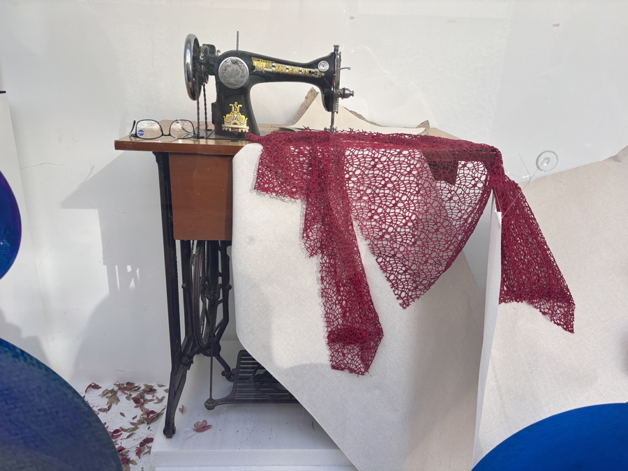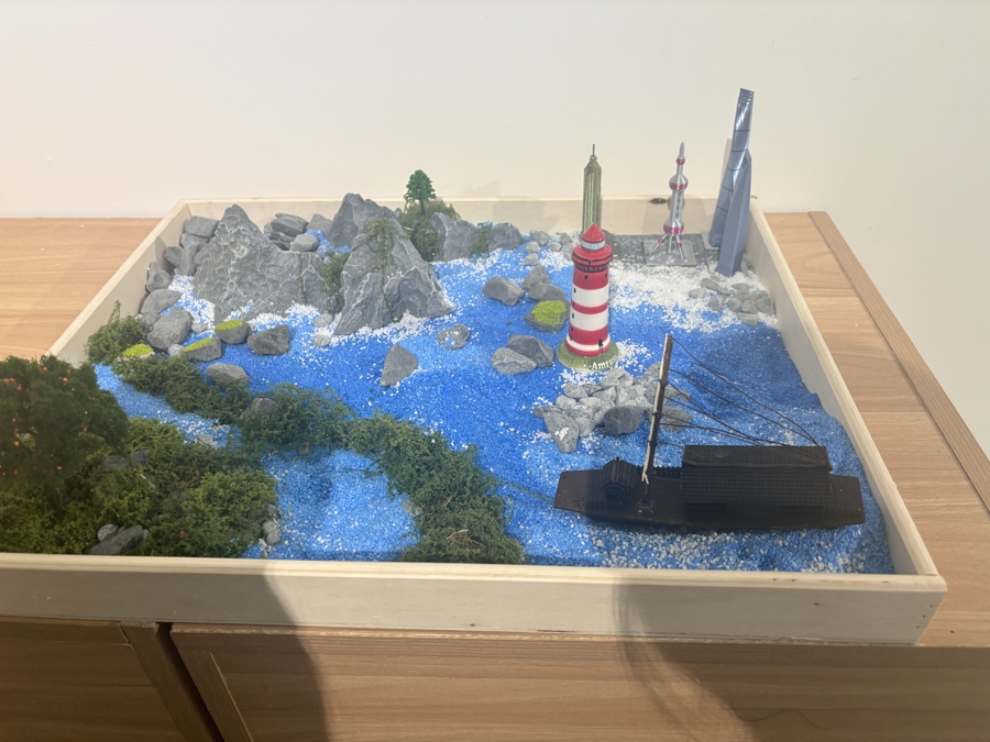 碧蓝色的沙砾堆成海洋,蜿蜒曲折的山脉被放置在沙盘左上角,右下角,则停泊着一艘小小的乌篷船。“1950年,13岁的张爷爷从舟山群岛来到上海。”策展人郑薇说,“那时,上海和舟山之间还没有大轮船,往返只能靠私家乌篷船,摇摇晃晃一夜。有一次遇上风浪,张爷爷在船上颠簸了一周。”