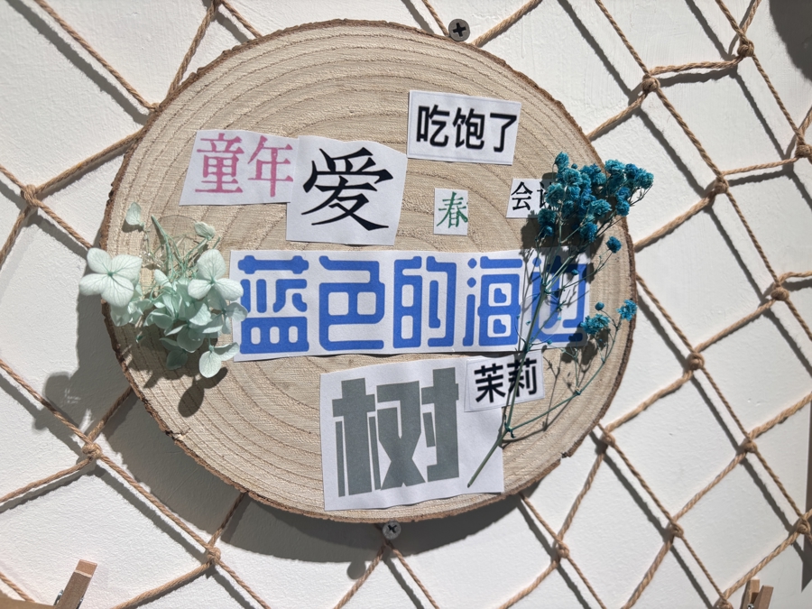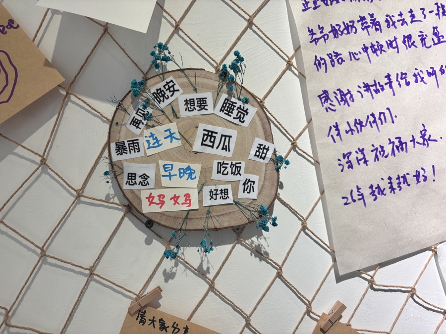 在留言区域,一幅拼贴作品吸引了记者的视线。“暴雨连天”“西瓜甜”“想要睡觉”等词语随意组合,而在这些生活碎片中间,“妈妈”和“好想你”被紧紧贴在一起。这幅作品的作者,是一位已经有些认知障碍的奶奶。郑薇告诉记者,“团队引导老人们创作文字拼贴作品时,会和他们说,如果我们提供的文字纸条里没有他们想要的,他们也可以自己写。”于是,在北辰的引导下,这位奶奶写下了“妈妈”两个字,将它仔细地贴在“好想你”旁边。“看到这幅作品,我感到一种平凡的诗意。”北辰说。