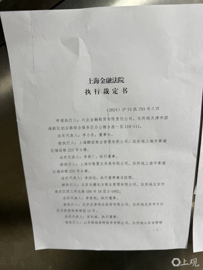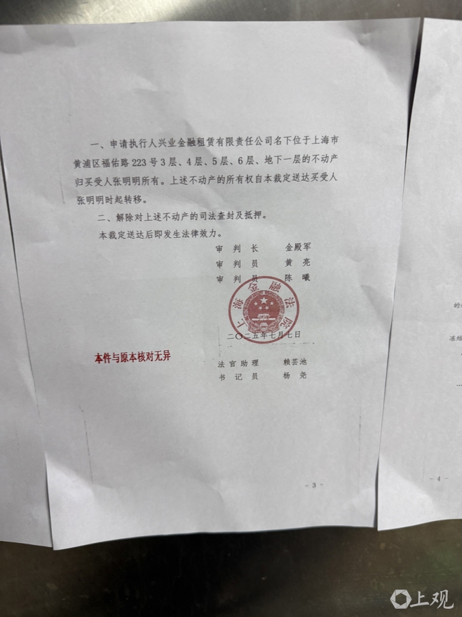 因新老业主、物业之间存在纠纷,2025年10月31日,福民商厦3-4楼新业主方发布了四楼摊位暂停营业的通知。从张贴的“上海金融法院执行裁定书”来看,目前,福民商厦地下一层及三到六层在经过法拍后属于新的买受人张明明。去年12月30日,上海金融法院再度发出“协助执行通知书”明确,涉案不动产拍卖成交后,实际承租人应当自2025年8月起按照原租赁条件与买受人重新签订租赁合同。