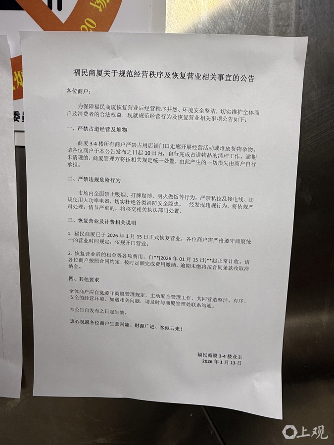 在四楼电梯一侧,记者发现贴有“上海金融法院执行裁定书”和“福民商厦关于规范经营秩序及恢复营业相关事宜的公告”。公告称“福民商厦已于2026年1月15日正式恢复营业”,落款为“福民商厦3-4楼业主”。