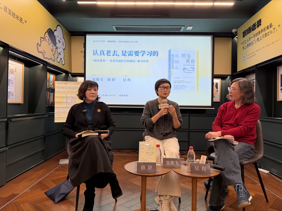 随着社会老龄化进程加速,“老去”已从个体家庭的私人议题,逐渐成为关乎全民的公共命题。然而,多数人在面对亲人老去、自身步入老年的过程中,往往缺乏足够的知识储备与心理准备,在疾病照护、伦理决策、情感应对等方面陷入迷茫与挣扎。《照亮黄昏:一名老年病医生的建议》是英国老年病学专家露西·波洛克的行医半生记,也是一部关于衰老、病痛与尊严的现实之书。近日在思南书局,上海作协副主席薛舒与该书译者、麻醉医生兼缓和医疗从业者夏燕飞在作家吴玫的穿针引线下,展开一场关于“认真老去”的对话。